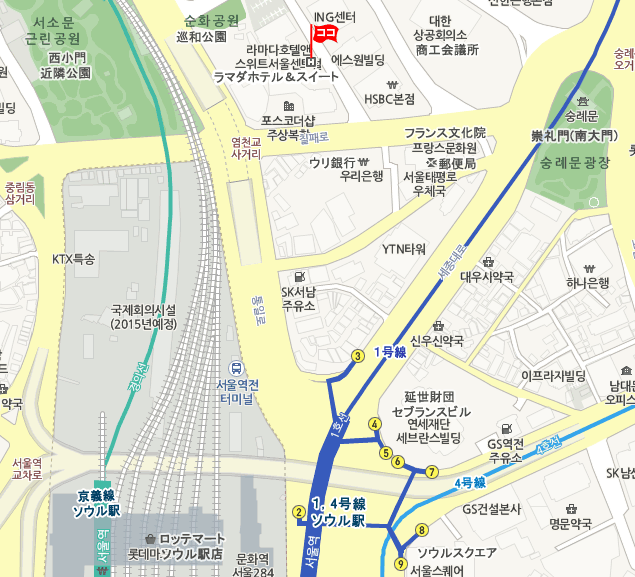 •  空港鉄道A`REX : 仁川国際空港駅(Incheon Int'l Airport)から乗車しソウル駅下車後徒歩10分