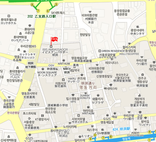 • 地下鉄 : 空港鉄道A`REXに乗車し弘大入口駅下車後、地下鉄2号線 乙支路入口駅6番出口から徒歩約2~3分