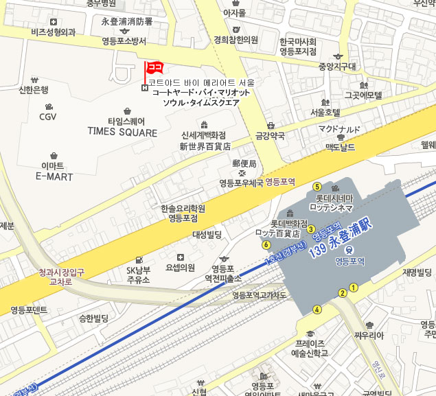 コートヤード・バイ・マリオット・ソウル・タイムスクエアは世界規模のホテルチェーンマリオットホテルグループの韓国国内4箇所目のホテルです。ホテルは2009年に永登浦(ヨンドゥンポ)に誕生した複合ショッピングモール【TIMES SQUARE】の上層フロアにあり、TIMES SQUAREには新世界百貨店や大型マート、ファッション、韓国コスメ、書店、子供用品まで様々な店舗がありますので、ショッピングに最適です。また各種レストランやフードコートもあり、食事にも大変便利です。