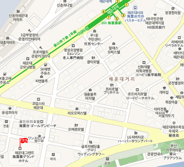 •  地下鉄から: 地下鉄2号線  海雲台(Heaundae)駅 3番出口より徒歩約15分。