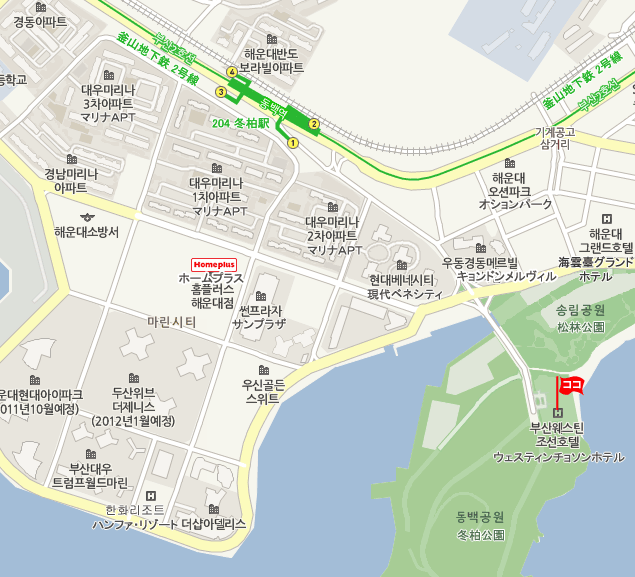 •  地下鉄から: 地下鉄2号線 冬柏(Dongbaek)駅 1番出口より徒歩約10分。