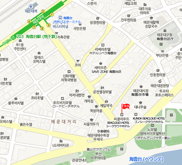 •  地下鉄から: 地下鉄2号線  海雲台(Heaundae)駅 3番出口より徒歩約5分。