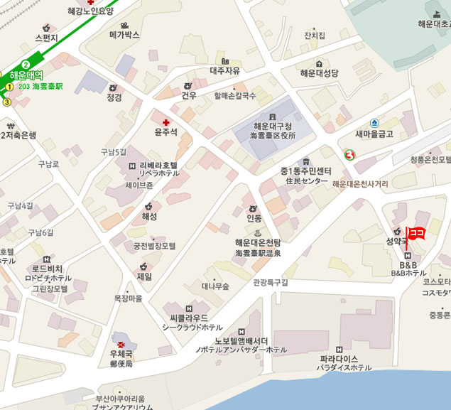 •  地下鉄から: 地下鉄 2号線  海雲台(No.203 Heaundae)駅 3番出口より 徒歩 約12分