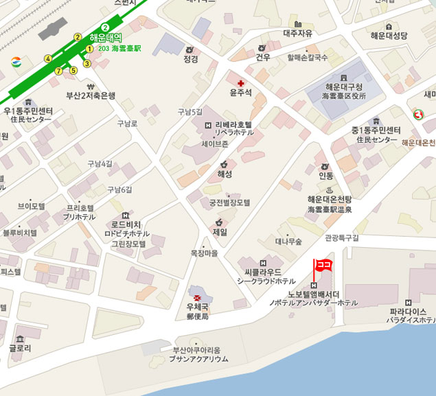 •  地下鉄から: 地下鉄2号線  海雲台(Heaundae)駅 3番出口より徒歩約12分。