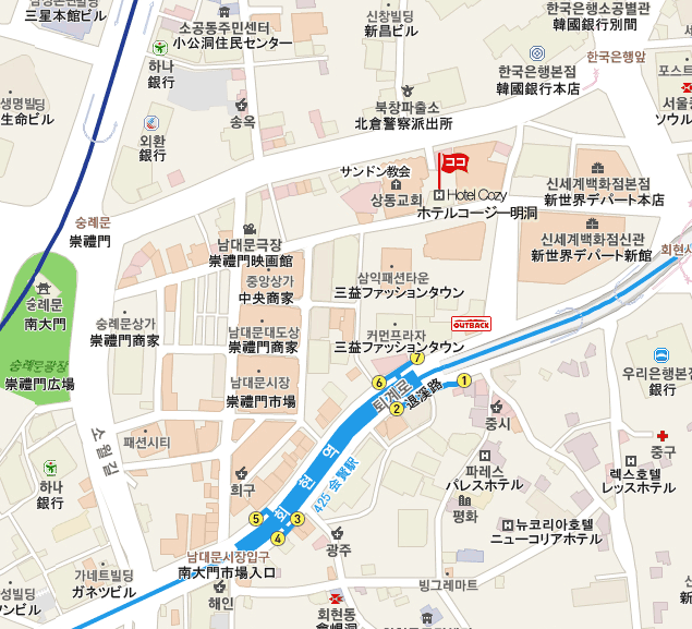 • 地下鉄 : 空港鉄道A`REXに乗車し、ソウル駅で4号線に乗り換えて会賢(フェヒョン)駅7番出口から徒歩3分。