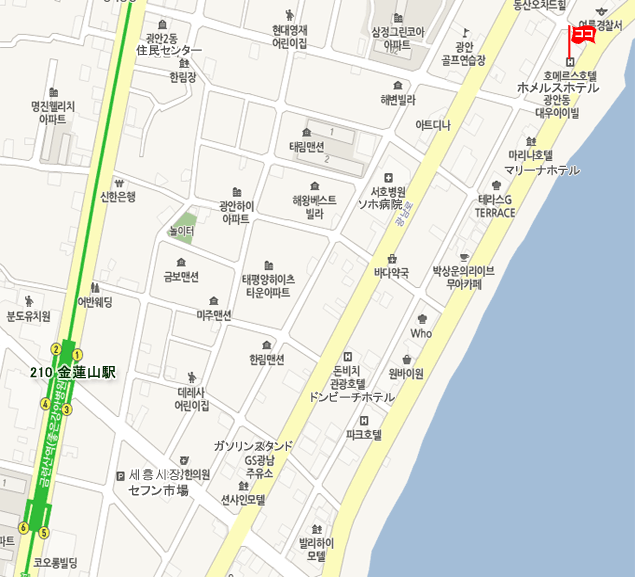 • 地下鉄から:地下鉄2号線 廣安(Gwangan)駅 3番出口より徒歩約8分。