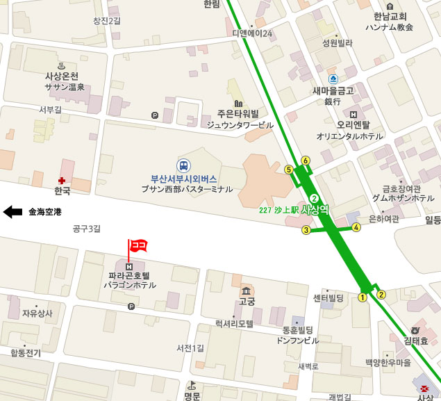 •  地下鉄から:地下鉄2号線 沙上(sasang)駅 3番出口より 200メートル。徒歩約5分。
