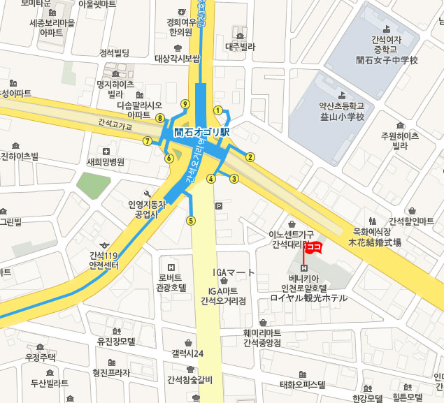 地下鉄1号線 カンソクオゴリ(No.1123 Gangseogogeori)駅3番出口から 徒歩 約2分。