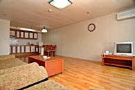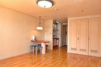 宿泊施設はタワーコンドとビラコンドの二つがあり、タワーコンドは5階から14階までが客室になっています。客室は自炊施設のついたマンションスタイルで、リトルベアー(14坪)とビックベア(28坪)の2タイプがあります。ビラコンドは1階から4階まで客室となっており、パンダルーム(20坪)、チャンピオンルーム(31坪)とご家族やグループで利用しても余裕の広さとなっています。付帯施設にレストラン、コーヒーショップ、プールなどがあります。