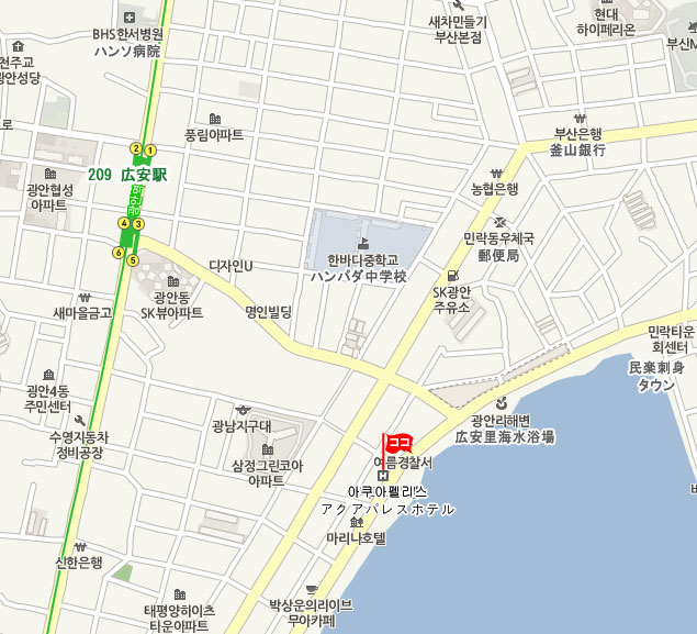 •  地下鉄から:地下鉄 2号線 広安(No.209 Gwangan)駅 3番又は5番出口より 徒歩 約10分