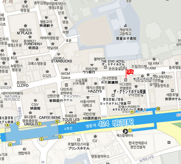 • 地下鉄 : 空港鉄道A`REXに乗車し、ソウル駅で4号線に乗り換え明洞駅9番出口から徒歩約2分。
