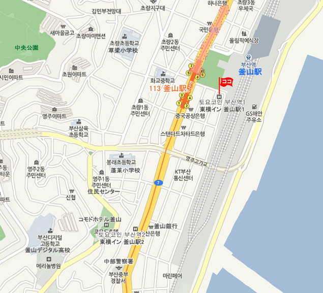 更に西面(Seomyeon)駅にて地下鉄1号線に乗換えて釜山(Pusan)駅にて下車。 6番出口より徒歩約2分。