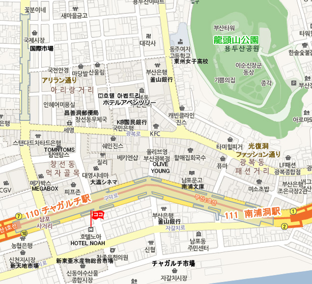 釜山ノアホテルは釜山の繁華街.南浦洞(ナンポドン)に位置し、釜山の主な観光地へのアクセスが抜群な立地にある、ショッピング、観光、グルメにフル活用できる便利なホテルです。韓国最大の海鮮市場であるチャガルチ市場