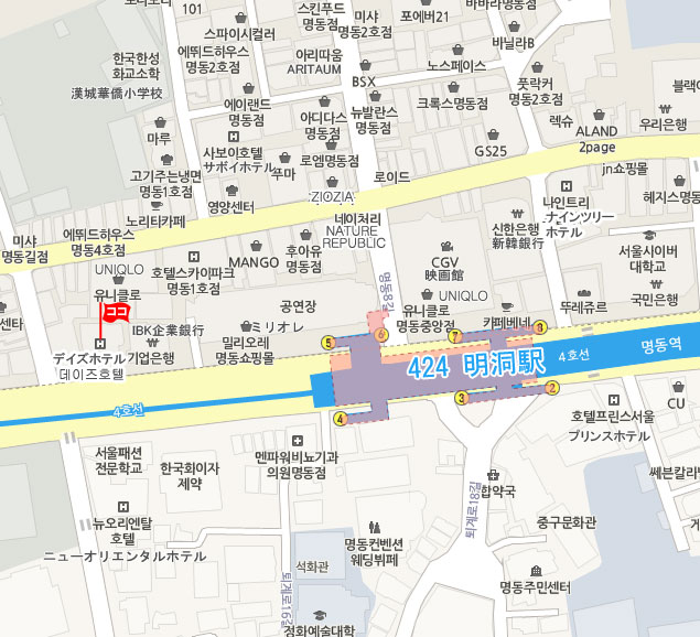 • 地下鉄 : 空港鉄道A`REXに乗車し、ソウル駅で4号線に乗り換え明洞駅5番出口から徒歩約3分。
