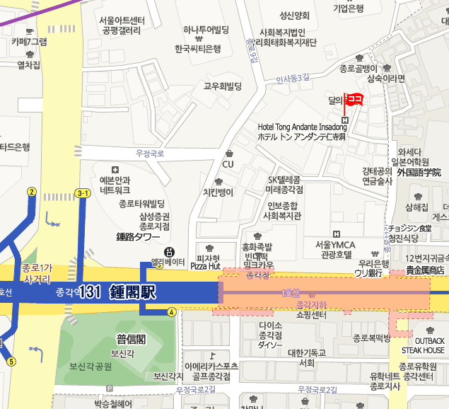 • 地下鉄 : 仁川国際空港(Incheon Intl Airport)で空港鉄道に乗り、ソウル駅で地下鉄1号線に乗換えて鍾閣(Jonggak・131)駅下車で下車。3番出口から徒歩約5分。