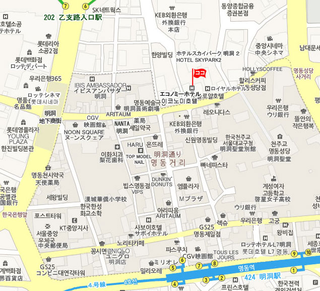 • 地下鉄 : 空港鉄道A`REXに乗車し弘大入口駅下車後、地下鉄2号線 乙支路入口駅5番と6番出口の中間の出口から徒歩7分