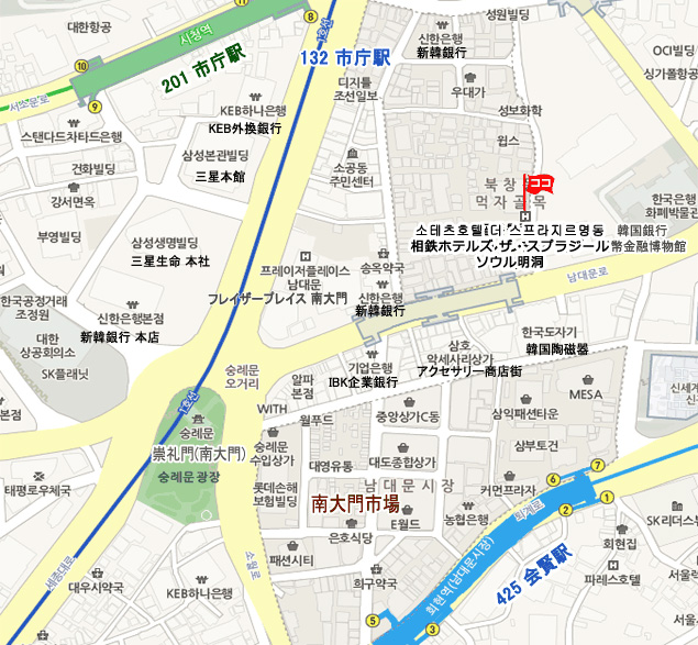 バス番号6001番(明洞方面行き)に乗車後、南大門市場下車後、徒歩約5分。