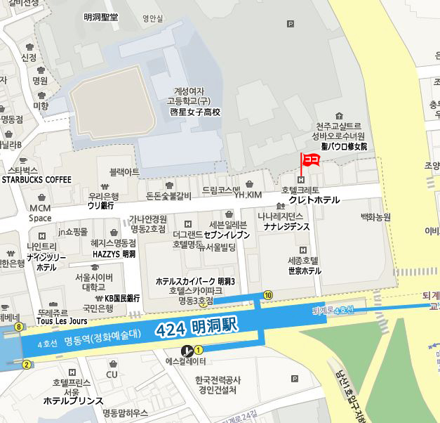 • 地下鉄 : 空港鉄道A`REXに乗車し、ソウル駅で4号線に乗り換えて明洞(ミョンドン)駅10番出口より徒歩3分