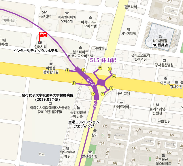 • 地下鉄 : 空港鉄道A`REXに乗車し金浦空港駅にて地下鉄5号線に乗換、鉢山駅1番出口より徒歩5分