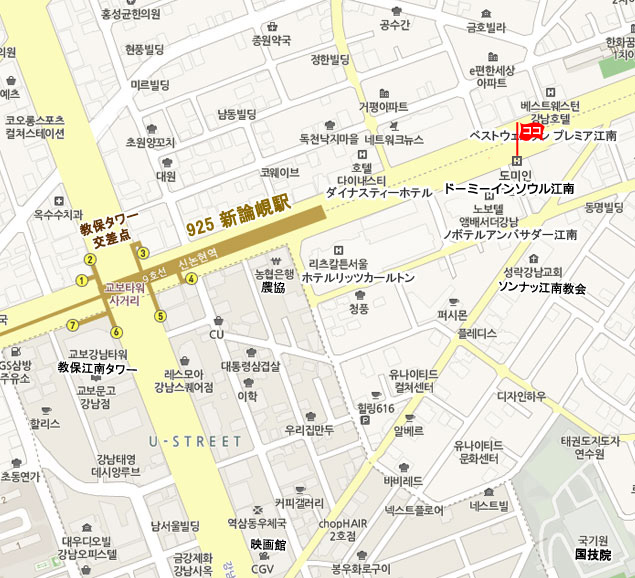 6000番(蚕室行き)バスに乗車し、地下鉄9号線新論峴(シンノニョン)駅(中央車路)にて下車。徒歩約13分。