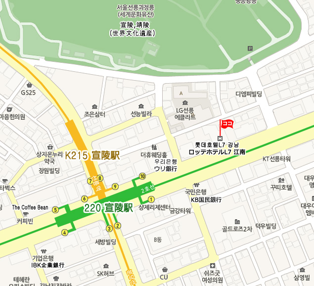 • 地下鉄 : 空港鉄道A`REXに乗車し、弘大入口駅で2号線に乗り換え宣陵(Seolleung)駅10番出口から徒歩約3分。