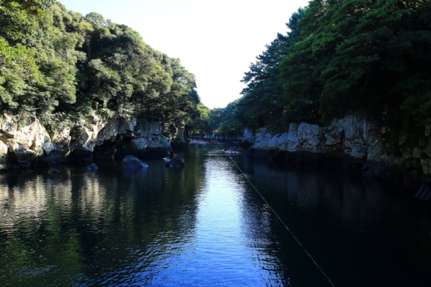 西帰浦にある、高さ22メートル、幅12メートルで、滝つぼの水深は20メートルという壮観を誇る天地淵瀑布。「天地淵」とは神の池という意味を持つ言葉で、玉皇上帝に使える7人の天女が玉の笛を吹きながら雲の階段を下りて地上に降りてきて、この池で沐浴をしたという伝説が残っています。ここは天然記念物163号にも指定されている膽八樹が自生しているところで、それ以外にも様々な珍しい植物や様々な木々が鬱蒼とした森を成しています。天然記念物379号として保護されているこの森に1キロの散策路があり、それに沿って歩くと滝にでます。