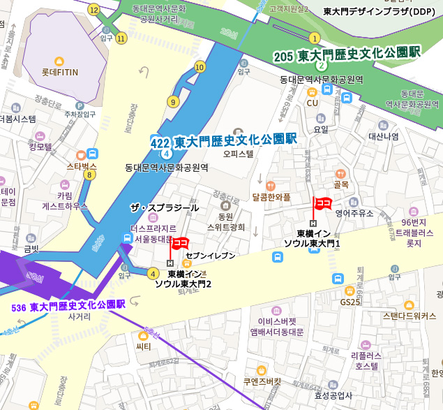 • 地下鉄 : 空港鉄道A`REXに乗車しソウル駅にて地下鉄4号線に乗り換え、東大門歴史文化公園にて下車。4番出口より徒歩約3分