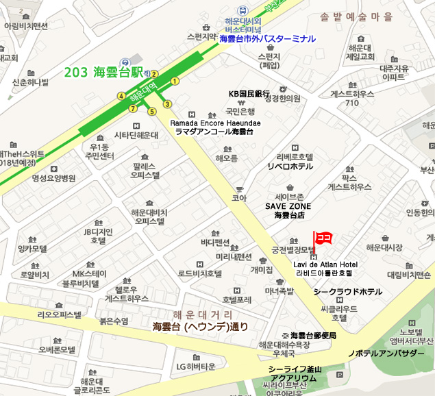地下鉄から: 地下鉄2号線 海雲台(Heaundae)駅 3番出口より徒歩約1分。