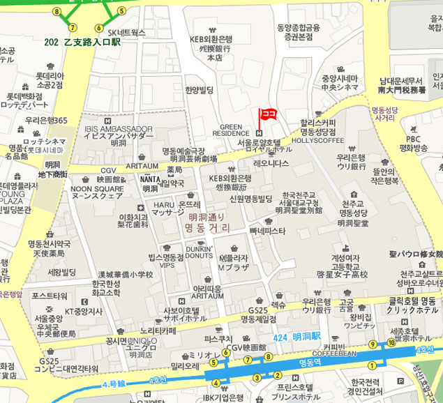 • 地下鉄 : 空港鉄道A`REXに乗車し、弘大駅で2号線に乗り換え号線乙支路入口(Euljiro1(il)-ga)駅下車5番出口から徒歩約7分。