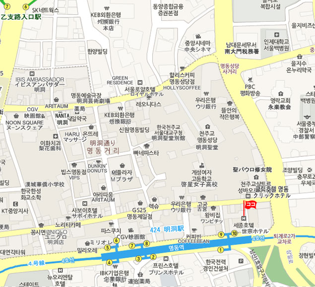 • 地下鉄 : 仁川国際空港(Incheon Intl Airport)から空港鉄道に乗車し、ソウル駅にて4号線に乗換えて 明洞(Myeong-dong) 下車。10番出口からすぐ。