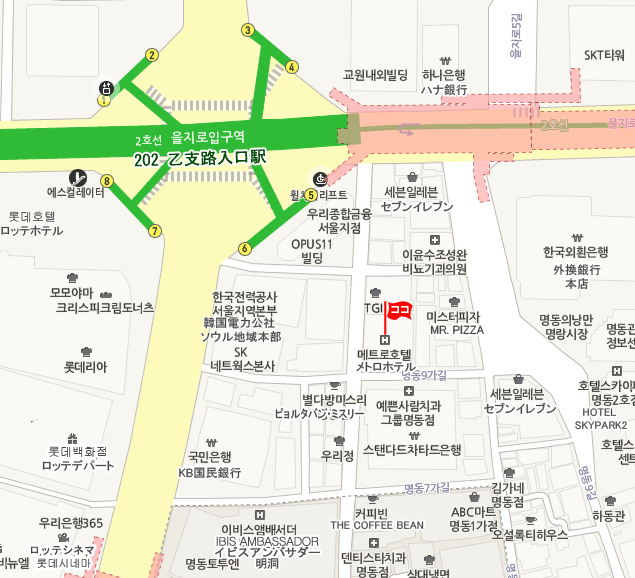 Route1 (市庁方面行き/6701番)バスに乗り ロッテホテルソウル(明洞)前にて下車後、徒歩約8分。