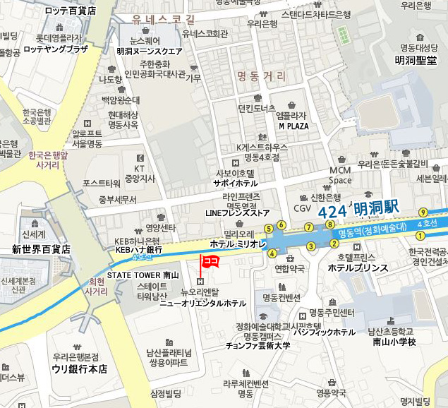 • 地下鉄 : 仁川国際空港(Incheon Intl Airport)から空港鉄道に乗り、ソウル駅にて4号線に乗換えて明洞(Myeong-dong)駅下車。4番出口から徒歩1分。