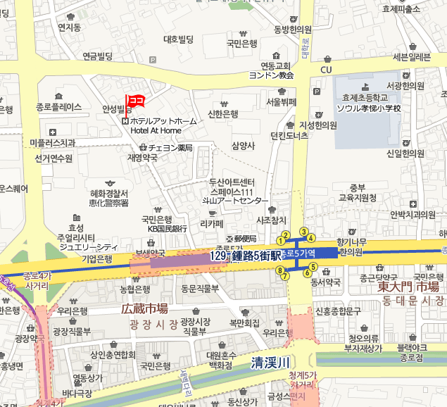 • 地下鉄 :  仁川国際空港(Incheon Intl Airport)から空港鉄道に乗り、ソウル駅にて1号線に乗換えて鍾路5街(Jongro 5(o)-ga)にて下車。1番出口から徒歩約5分。