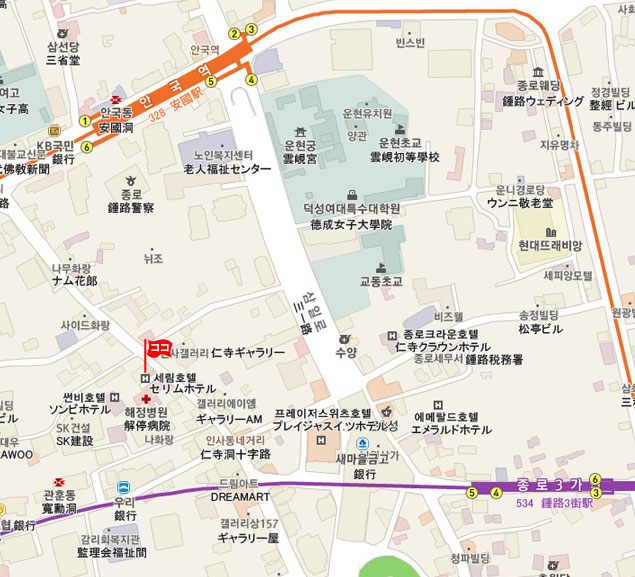 地下鉄3号線に乗換えて安国(Anguk)駅にて下車。6番出口から徒歩8分。