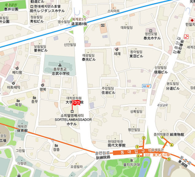 ♣ 金浦空港 ⇒ ホテル アクセス • 地下鉄 : 金浦空港 (Gimpo Int’l Airport)から地下鉄5号線に乗車し、鐘路3街(Jongno3(sam)-ga)駅で地下鉄3号線に乗換えて 東大入口(Dongguk Univ.)駅で下車。1番出口から徒歩約5分。 • タクシー : 一般17,400ウォン程、模範45,000ウォン程、所要時間 : 約40分 ♣ その他 情報 • チェックイン 15:00、 チェックアウト 12:00 • 全室禁煙 • NHKなど衛星放送 受信可。 • Wi-Fi(全客室有、有料、パスワードはフロントにて要確認)、有線LAN接続(全客室有、有料) • 徒歩 2分以内にコンビニあります。 • 現地の事情により予告なしに変更される場合もございます。あらかじめご了承ください。 • 予約の確認、変更依頼、取消はMy予約確認ページにて行えます。 • メール送受信状況の確認、お客様とハナビツアーとのメッセージのやりとりはMy予約確認ページ ⇒ メール送受信 にて行えます。 • 最終更新日 : 2017. 9. 18