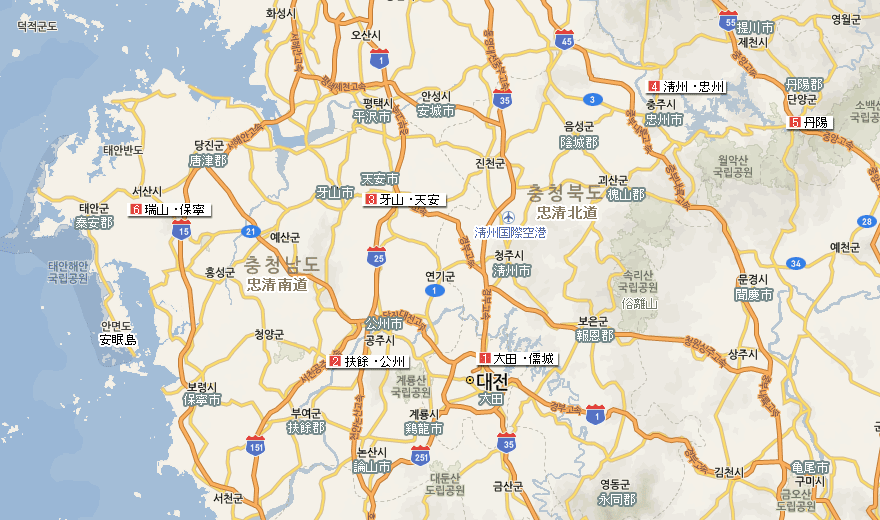 大田 ・儒城 扶餘 ・公州 牙山 ・天安 淸州 ・忠州 丹陽 瑞山 ・保寧