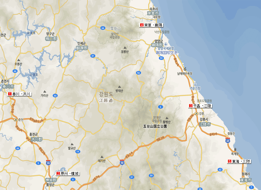 江原道マップのエリアアイコン()又は、下のエリアリストをクリックすると、そのエリアの詳細情報ページへ移動します。
