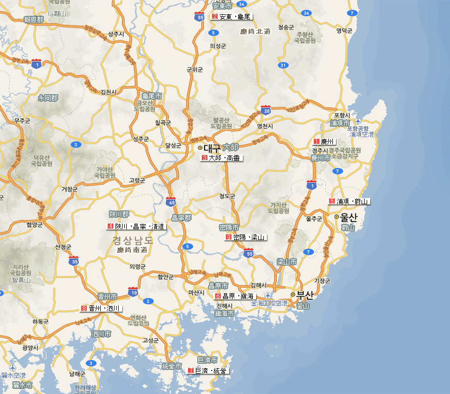慶州 安東 ・龜尾 大邱 ・高靈 陜川 ・昌寧 ・清道 浦項 ・蔚山 昌原 ・鎭海