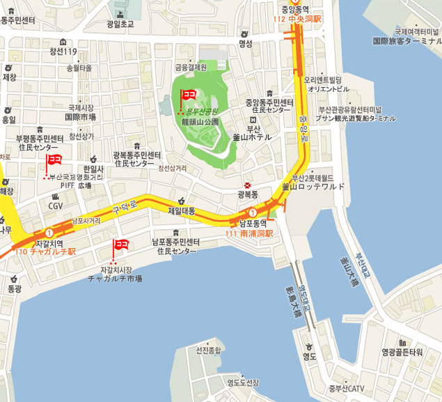 釜山観光の中心地、釜山の代表とも言える龍頭山公園はいつも数多くの観光客でにぎわっています。この公園内には釜山タワー、豊臣秀吉から朝鮮を守った李舜臣(イスンシン)将軍の銅像など見どころもいっぱいです。釜山市民の憩い場としても人気の高い龍頭山、一度訪れてみてください。 公園内にある120メートルの高さを誇る釜山タワーも1973年完成以来釜山市民から愛されてきました。タワーの展望台からは釜山の町並みが一望でき、釜山という名前の由来もひと目でわかります。夜には昼とはまた違った釜山の夜景も楽しめることができるのでおススメです。