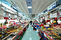 チャガルチ市場は1950年代から南浦洞周辺に集まりだした小さな露天の集まりが始まりだったと言われ、1970年に釜山市が海を埋め立て水産協同組合を設立しチャガルチ市場を開きました。現在の建物は2006年にオープンした新しいビルで以前のゴチャゴチャして薄暗かった雰囲気を取り払い、観光客にとっても買い物しやすく生まれ変わりました。チャガルチ市場は、地下鉄1号線のチャガルチ駅から徒歩1分と駅の目の前にありアクセスも便利。 市場に入ると新鮮な魚介類が所狭しと並べられ、アジョシ、アジュンマ達の元気な掛け声が聞こえてきます。新鮮な魚をを買ってその場でお刺身を楽しんでもいいし、日本へのお土産として干しエビや煮干、スルメ、海苔など干し物を2階にある乾物市場で買うこともできます。