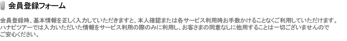 ※ご利用のPC環境により会員登録が正常処理されない場合がございます。 その場合、ハナビツアー(  hanabitour@yahoo.co.jp )まで希望IDを ご連絡頂けましたら、弊社にてIDを作成し仮P/Wをご連絡させて頂きます。