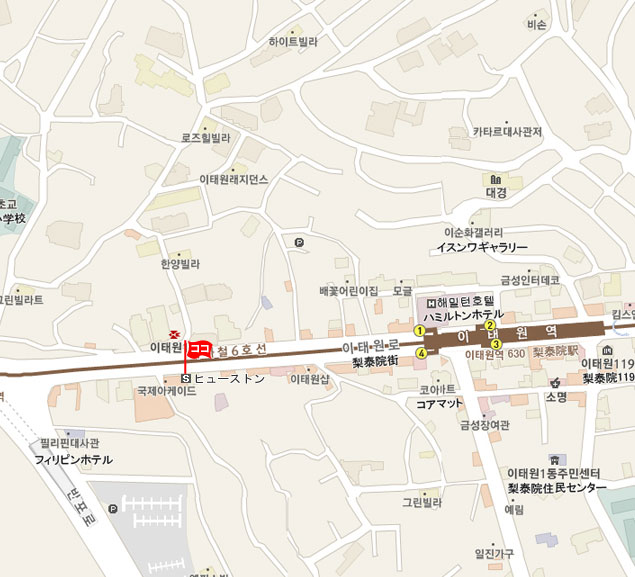 現地 アクセス  地下鉄 6号線の梨泰院駅 (No.630 イテウォン・Itaewon)で降りて、