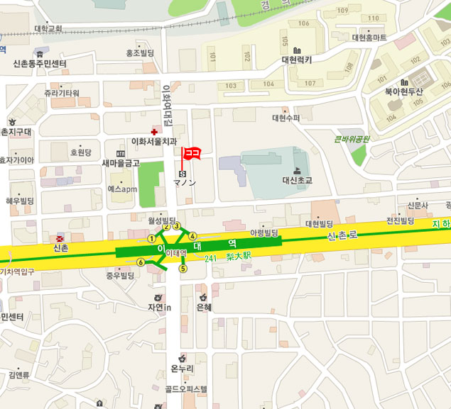 現地 アクセス         地下鉄2号線イデ(梨大・Ehwa Woman University)駅2番出口から徒歩約7分