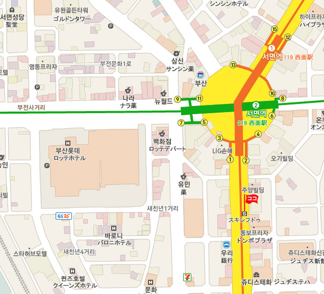 地下鉄 1号線と2号線の 西面 (No.119、No.219 Seomyeon)駅で降ります。