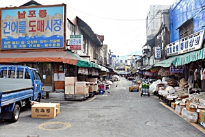 釜山地下鉄一号線ナンポドン(南浦洞:남포동)駅で下車し2番出口を出ます。出口を出、反対方向へ直進すると、徒歩約5分ほどで南浦洞乾魚物市場(ナンポドンコンノムルシジャン)が見えてきます。