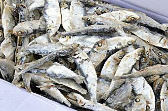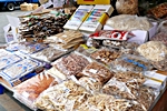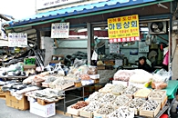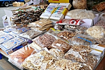 扱っている品物は市場内の場所によって微妙に変化していきます。鮮魚市場の近くでは各種魚の干物を扱うお店が多く、奥に入るにしたがって、スルメやタコの燻製などおつまみ用の干物や塩辛、明太子などのお店が多くなり、更に海苔、昆布、ワカメなどを扱う卸売りや小売店のお店が広がっていきます。市場では水に戻してからスープにして食べるとおいしいタラの乾物や一風変わったエイの乾物などもありますが、この市場のメインはカタクチイワシになります。大きさや産地によって、1キロあたり5000ウォン前後の物から10万ウォンを超える高級品までと種類も多く揃っています。韓国では小さな唐辛子と一緒に炒めて食べたり、そのままコチュジャンにつけて食べたりと料理法も豊富な人気のある乾物です。