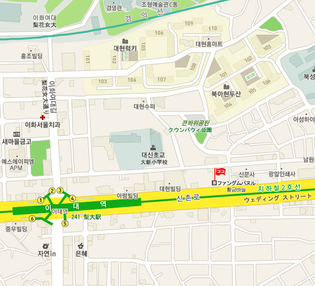 現地 アクセス  地下鉄2号線梨大(イデ、Ewha Womans Univ.)駅 5番出口 徒歩2分