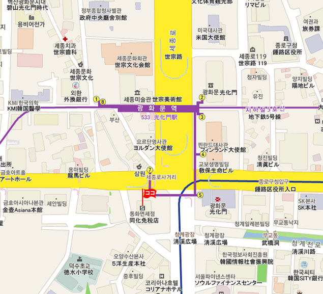 地下鉄 5号線の光化門駅 (No.533 クァンファムン・Gwanghwamun)駅で降ります。駅 6番出口を出てすぐ。 |