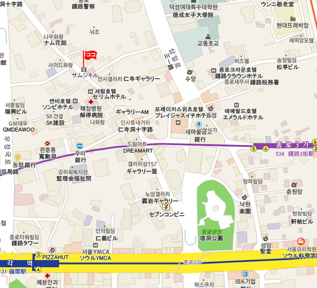 地下鉄 3号線の安国駅 (No.204 No.328 アングッ・Anguk)で降りて、 駅 6番出口を出て、徒歩 約 5分所要。