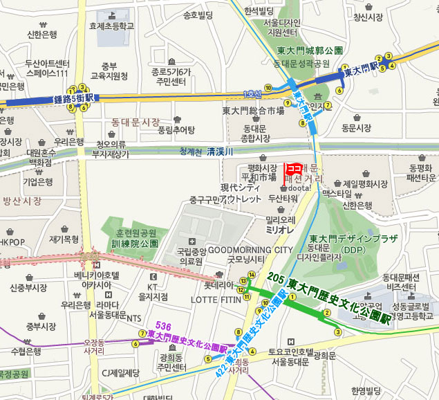 地下鉄 1·4号線の東大門運動場駅 (No.128 · No.421 トンデムン・Dongdaemun)で降り、 駅8番出口を出て、徒歩 約5分所要。 地下鉄 2·4·5号線の東大門駅 (No.205·422·536 トンデムンウンドンジャン・Dongdaemun Stadium) で降り、駅14番出口を出、徒歩 約5分所要。